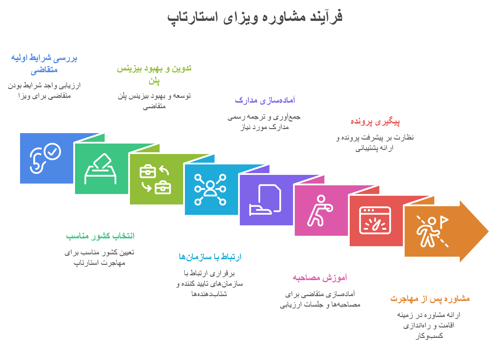 | 8. مشاوره پس از دریافت ویزا | راهنمایی در زمینه اقامت، ثبت شرکت، افتتاح حساب بانکی و شروع فعالیت اقتصادی. |